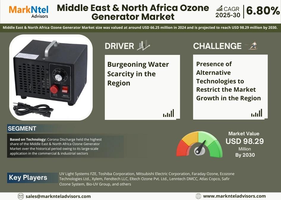 MarkNtel Advisors, a leading market research and consulting firm, has announced the release of its latest study titled Middle East & North Africa Ozone Generator Market Research Report: Forecast (2025-2030). This report provides a detailed assessment of the Middle East & North Africa Ozone Generator Market, covering its evolving dynamics, emerging trends, key growth drivers, major challenges, and competitive landscape.